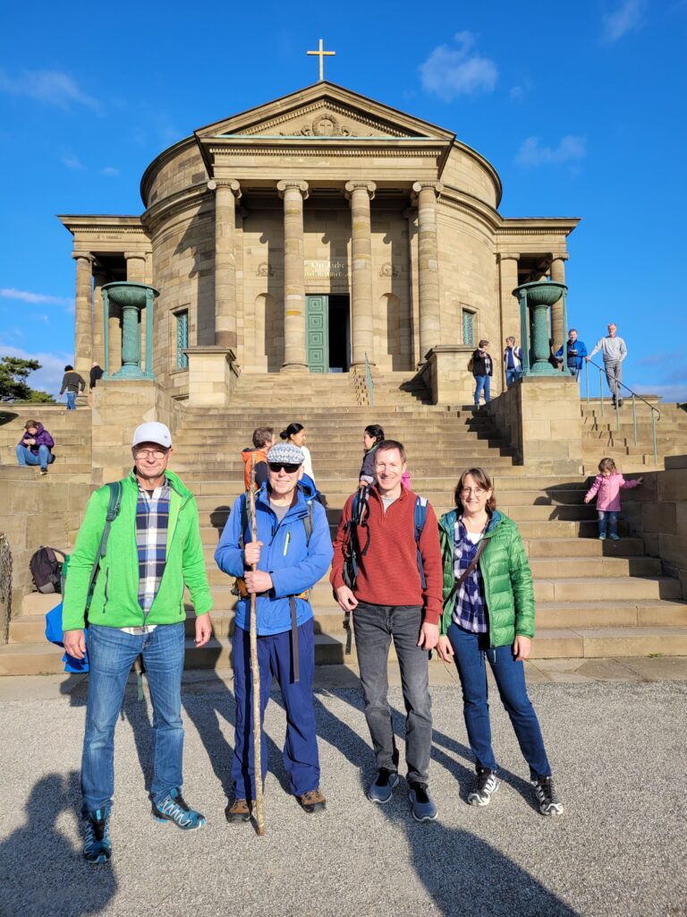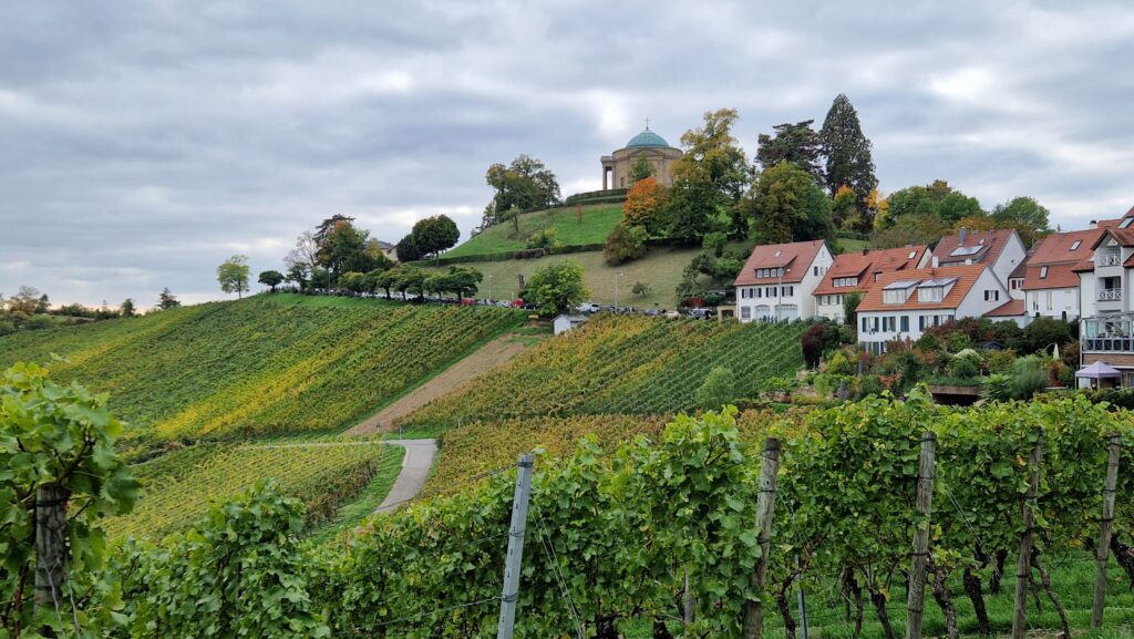 Nach etwa elf Kilometern erreichten wir den Württemberg und besichtigten die darauf erbaute Grabkapelle. Der vielleicht romantischste Ort Stuttgarts ist gut besucht und bietet weitere schöne Ausblicke über die Weinberge und das industriell bebaute Neckartal. Zum Abschluss der Wanderung kehrten wir im Rotenberger Weingärtle ein und genossen vorzüglich zubereitete Speisen und Getränke – auch wenn wir leider nur aus einer eingeschränkten Karte wählen konnten.